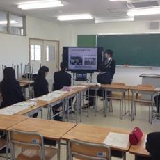 熊本地震直後の学校や近隣の様子,そしてこれまでの復興の様子について,丁寧に報告をしてくださいました。震災直後には体育館だけではなく,校庭には車で避難してきた方々が溢れていたそうです。そのような中,生徒会がボランティア活動を行い,避難してきた方々のお手伝いをしたことなどをお聞きしました。また,地震の影響で学校施設の一部が使用できなくなったことや,様々な行事への影響などについて話を聞きました。