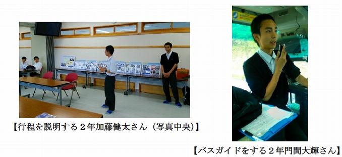 7月2日(土)に行われたオープンスクールにおいて,事前に申し込みをした中学生と保護者合わせて21名を対象とした「バスツアー&まち歩き」を行いました。コースは,学校→七ヶ浜国際村→多賀城イオン→末の松山→学校というコースで,バスと徒歩で被災の爪痕を巡りました。大会議室で軽食をとっていただきながら,生徒会副会長2年加藤健太さんが行程を紹介した後で,七ヶ浜国際村に向かいました。バスの中では,生徒会執行部の2年門間大輝さんがバスガイド役として多賀城高校の防災・減災活動の様子を伝えました。