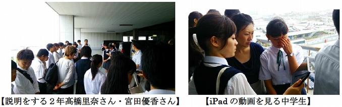 七ヶ浜国際村では,2年生の門間大輝君が七ヶ浜の被災の様子や多賀城高校が国際村で行っている外国人向けのボランティア活動の紹介をiPadを用いて行いました。中学生と保護者の方々は,門間さんの説明にしっかりと耳を傾けていました。