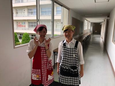 配膳は生徒会、防災委員会、女バレーボール部の皆さんで行います。「訓練」ですので、ミスが出ないように心がけて豚汁を配ってゆきます。