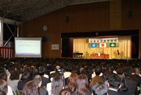 はじめに教育長式辞があり、「多賀城高等学校の災害科学科は、東日本大震災から学んだ教訓を確実に次世代に伝承するとともに、今後国内外で発生する災害から一人でも多くの命とくらしを守ることができる人材を育成するため、防災系学科としては、兵庫県の舞子高等学校環境防災科に次いで全国では二例目、県内では初めて開設したものであります。」と開設の意義に触れ、これまでの多賀城高校の様々な取り組みについて紹介されました。そして、「これからは災害科学科の設置によって、防災教育を県内外に広げるパイロットスクールとしての役割が大きくなります。学校全体で防災に関する知識・技能を習得する防災教育を行いながら、災害に関する科学的見地を修得する専門的教育を災害科学科で行うことで、防災教育の充実と深化に取り組んでいただきたいと考えております。」と大きな期待を寄せていただきました。