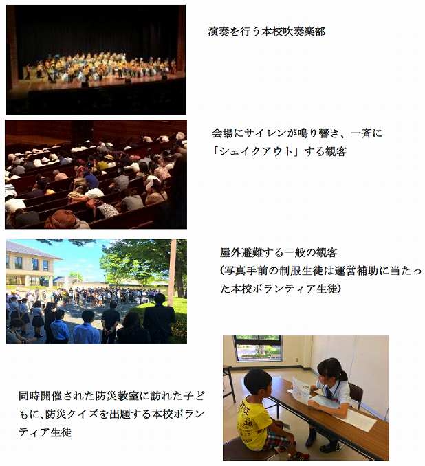 7月31日(日)、多賀城市文化センターにおいて、「コンサートで避難訓練」という防災行事が行われました。「コンサート中に大地震が起きたらどうするか」、施設管理者、観客、演奏者それぞれの立場で避難行動を経験する目的で、本校吹奏楽部が演奏中に地震が起き、約300人の観客が屋外へ避難するという形で訓練が行われました。