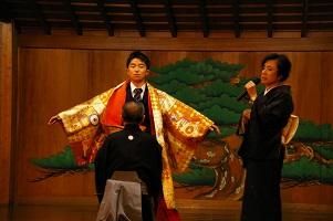 1日目は,金閣寺の見学と河村能舞台でのワークショップでした。金閣寺を初めて見た生徒が多く,写真をたくさん撮っていました。川村能舞台では,300万円もする着物を着せていただいたり,面を付けて歩いたりする体験をしました。
