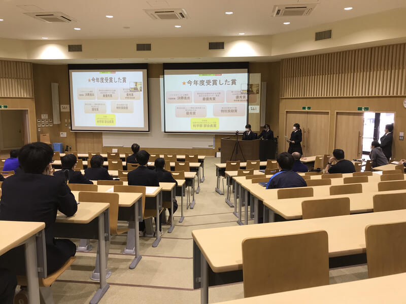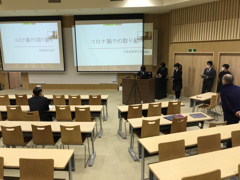 募金活動、避難訓練、巡検(栗駒巡検)、学校行事について発表を行いました。今年度はコロナ禍での取り組みを紹介しました。例年とは内容を変更しましたが、新たな学びは多くあったという発表でした。