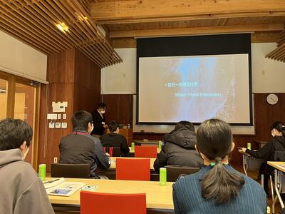 プログラム2日目は,初日の5つの班を解体・再編した4つの班に分かれて,生物の関係性を複雑に表現する環境情報図を作成し,班ごとに樽水ダムを中心とした環境を考察し,全体発表を行いました。異なる分野の生徒達が意見を交わすことで,生態系のまとまりを可視化する良い取り組みでありました。