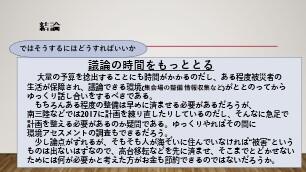 私は今回の東日本大震災メモリアルdayに参加して感じたことがあります。他校の生徒の研究発表を聞いてみて,とても感心しました。研究しているものは自分達と同じ防災・減災の分野ではあるものの,同じ題材とした時の深掘り具合がとても違うと感じました。私達はある議題があった時に,研究をどのように実行するかや,研究を行った後の改善点を大まかにしか出すことができていませんでした。しかし,他校の生徒は研究内容や改善点を大まかに出した後,それに具体性を持たせたり,先行研究にオリジナリティーを加えて発表したりしていました。そのような点を実際に見て,自分達ももっと研究して理解を深めるということをしていきたいと思いました。