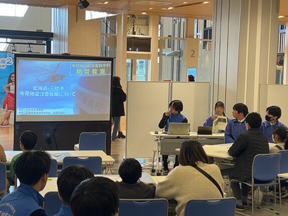 イオンモール新利府南館で一般の方対象の「北海道・三陸沖後発地震注意情報」に関する防災ワークショップ(仙台管区気象台監修)を行いました。事前学習として、仙台管区気象台職員の方による北海道・三陸沖後発地震注意情報に関する講義を受け、昨年度同様に行った災害科学科8回生(2年生)とともに模擬ワークショップを行いました。当日は小さいお子さんやそのご家族など53名に参加していただき、日頃の学びを社会に還元することができました。