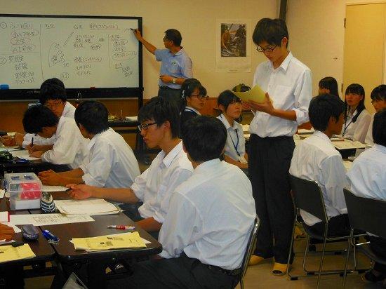 一日で学んだことをグループで話し合い,その結果をグループの代表が全体で発表し,結果を共有化しました。その後,高木浩一教授から太陽光パネルの起電力測定の実験を指導していただき,得られたデータの処理方法を通して数学の重要性を学びました。また,本校OBの理工学部3年生の山田崇寛さん,旦尾一樹さんから大学での生活や高校時代のお話をしていただくなど貴重な体験ができました。