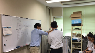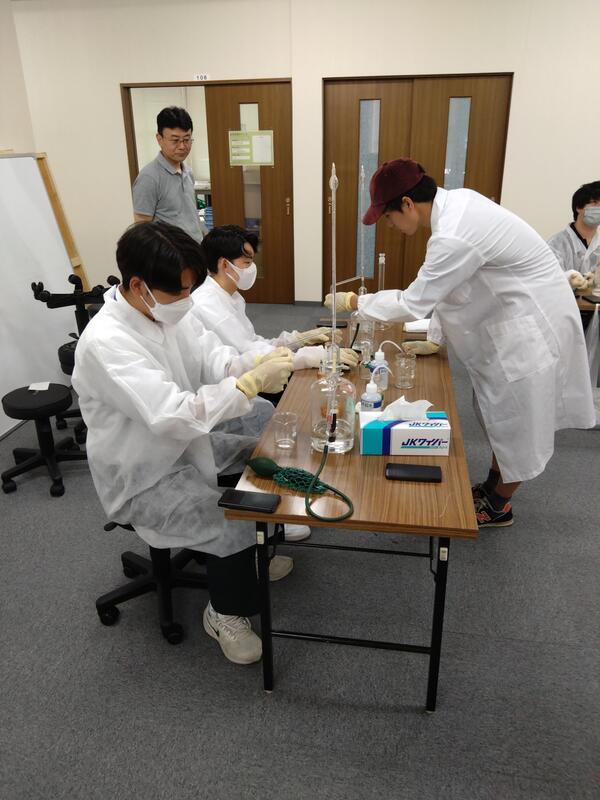 1日目の夜には,多賀城高校生徒ための特別プログラムが宿泊先の岩手県青少年会館研修室にて行われました。岩手大学理工学部教授・高木浩一先生,准教授・三浦健司先生の御指導のもと,「研究とは何か」を理解した上で,実験を実施し,その結果をまとめながら考察し説明するという実習を体験しました。本校の卒業生である学生2名も実習のサポートをしてくれました。