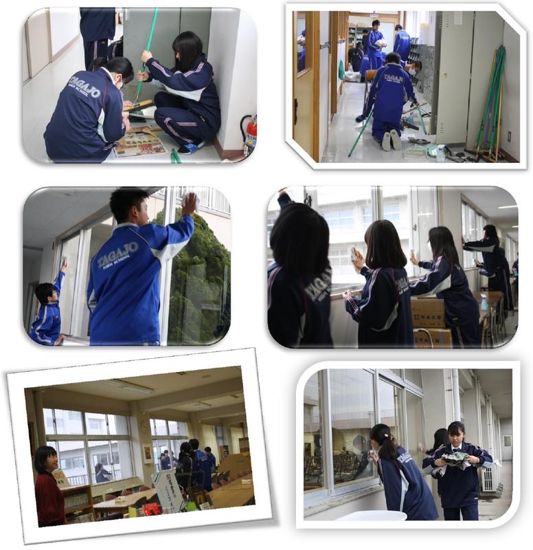 3月2日(木)7校時の総合的学習の時間に、2学年全員で校舎内の清掃奉仕活動を行いました。高校入試(後期)および、今年度の終了が間近であるということで、自分の手で校舎を清掃し、公共心・協調性を養うという目的に実施しました。また、今回の清掃では特に「自ら考え,効率的かつ科学的・衛生的に清掃を行う」ことを心がけ奉仕活動に取りかかりました。