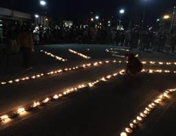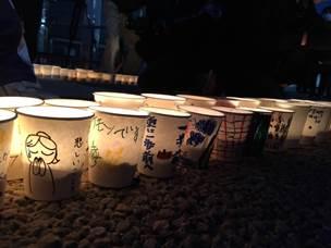 貞観津波の際も犠牲者慰霊のために灯されたという万灯皿188枚に火を灯し,さらにそれぞれのメッセージが書かれた紙コップにも順に明かりが灯されて行きました。紙コップの灯火は「3.11」と形取られ,日が暮れた駅前広場に浮かび上がりました。