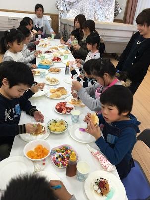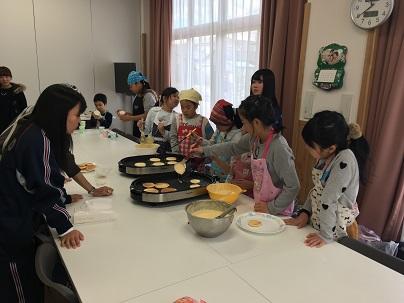 12月2日(土)、1年生のボランティア課題研究チームの6名が、多賀城市鶴ヶ谷復興住宅の集会所をお借りして、「みんなで 食べよう遊ぼうおしゃべりしよう!」と銘打ったこども交流会を開催しました。企画したのは、菊地海凪さん、前田詩衣さん、昆野小春さん、及川恵依さん、尾形菜々美さん、小野寺さくらさんの6名で、復興住宅のこども達とその近隣の鶴ヶ谷地区のこども達との交流を深めたいという考えで、チラシや回覧板で周知をしました。当日は小学生を中心に14名のこども達が集まりドッチボールや鬼ごっこなどをしたあと、みんなでホットケーキを作りました。初めて会う友達とも、すぐ仲良くなり交流会は大成功でした。