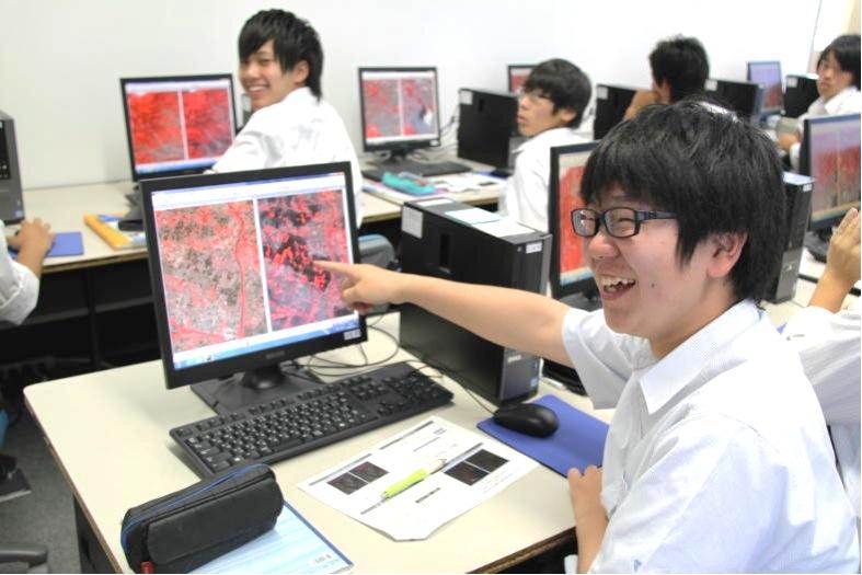 授業では生徒自身の課題研究のテーマと結びつけた話や,GIS(Geographic Information System:地理情報システム)を用いた災害対策についての話がありました。災害に襲われやすい地形の把握や過去の災害などを重ね合わせることによって,様々な情報の関連性が一目でわかるようになります。このような操作により,これまでには想像できなかった新しい情報を知ることができるようになることを学習しました。