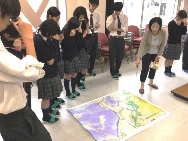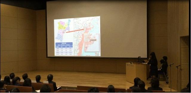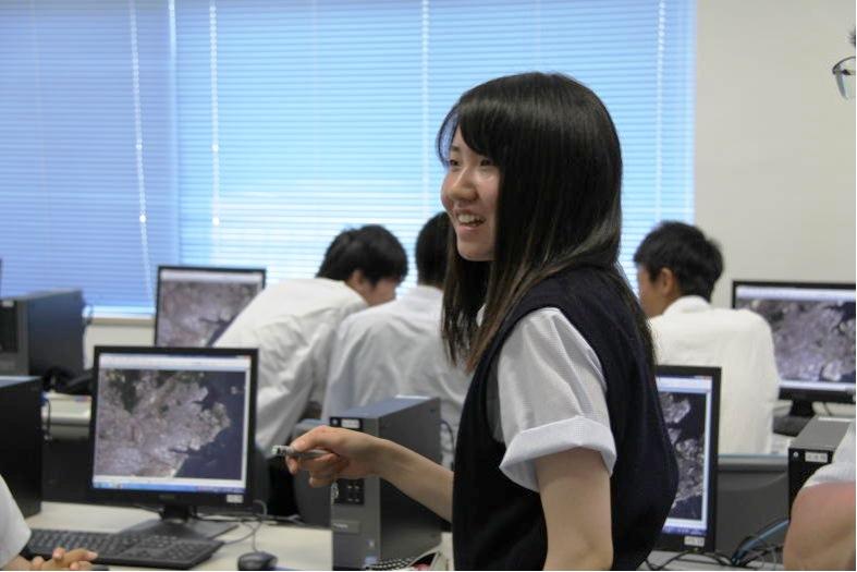 授業では生徒自身の課題研究のテーマと結びつけた話や,GIS(Geographic Information System:地理情報システム)を用いた災害対策についての話がありました。災害に襲われやすい地形の把握や過去の災害などを重ね合わせることによって,様々な情報の関連性が一目でわかるようになります。このような操作により,これまでには想像できなかった新しい情報を知ることができるようになることを学習しました。