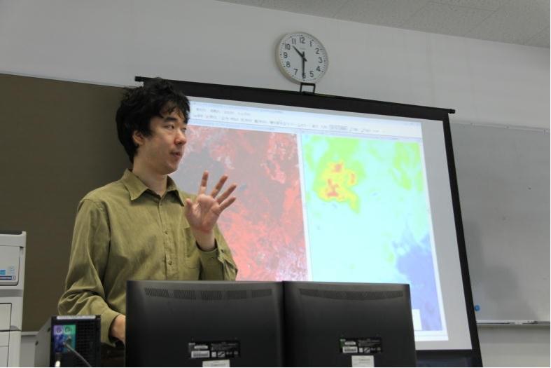 10月28日(金)ALOS2(だいち2号)衛星画像の教育目的利用の共同研究を行っている宇宙航空開発機構(JAXA)から永井裕人研究開発員を迎え,連携授業を行いました。9月のつくば研修では人工衛星の画像処理についての研修を受けており,今回は衛星画像を用いることによって,どんなことがわかるのか,できるのかとういう話を中心に授業が展開されました。