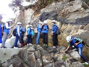 また今回は北海道室蘭栄高等学校理数科2年生の有志13人も一緒に浦戸諸島で実習を行いました。「北海道内で地層がこのような形で見える場所はほとんどない」とのことで,室蘭栄高等学校の生徒も矢継ぎ早に臼井講師へ質問を重ねていました。