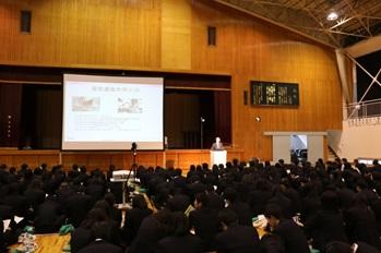 3月21日(火)2学年日本史B,地理B選択者を対象として,奈良大学文学部文化財学科教授の魚島純一先生の特別授業がありました。保存科学という一般的には馴染みのない研究ジャンルについて,軽やかな語り口と豊富な映像資料を基にわかりやすく解説して下さいました。