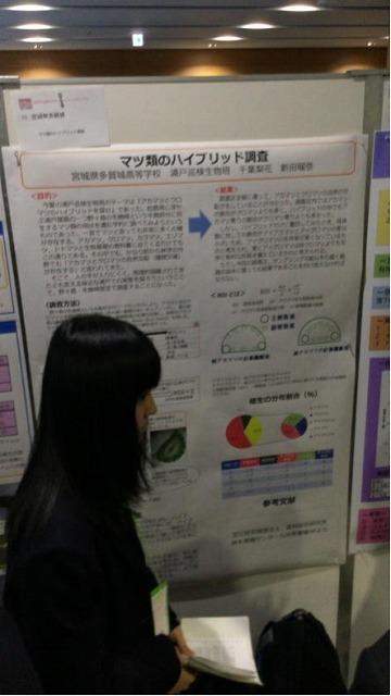 口頭部門ではでは,現在本校が取り組んでいるESD(「持続可能な開発のための教育)の考えに基づいた『多賀城高等学校が取り組む防災・減災教育』についてを,ポスター部門では『マツ類のハイブリット調査』についてを発表してきました。口頭発表では津波標識設置活動の他の伝承活動についてや,宮城県の復興状況についての質問をいただきました。ポスター発表ではハイブリット松の特徴や樹齢による差などについての質問を受けました。