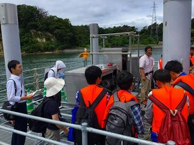 翌15日は生物班・地学班に分かれ,塩竈市浦戸諸島野々島・寒風沢島へ渡っての実習が行われました。マリンゲート塩竃からチャーター船で寒風沢島に向かい,東京大学生産技術研究所・潮流発電施設も見学させていただきました。各自がiPadを実験・実習ツールとして所持し,各種アプリを用いて走向傾斜測定や観察記録,現在地の確認やルートの確認に活用しながらの実習となりました。