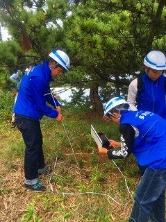 生物化学班は,寒風沢においてマツの生育環境を調査しながら,島の豊かな植生を観察しました。そして,野々島に渡ってから本格的にマツ及び土壌のサンプリングを行い,照度の測定,採集,iPadを使った記録など,役割を分担しながら必要なデータやサンプルを収集してきました。