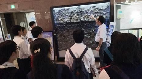 【産業技術総合研究所 地質標本館】はじめに地質調査総合センターの概要について講義を受け,災害軽減のため,活断層や火山などの地質研究,調査・観測が大変重要であることを学びました。 その後,地質標本館内をテーマ毎に解説していただきながら,日本列島周辺の震源分布,地震による液状化現象(はぎ取り標本),デスモスチルス骨格標本などを見学しました。 (写真撮影や記録はi-Padを利用)
