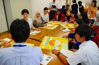 交流活動のワークショップでは、防災委員や生徒会のメンバーが混ざり、まず、東北大学が開発・啓発している「減災ポケット『結(ゆい)』プロジェクト」の英語版を使い、災害時に必要な事柄について話し合いました。その後、自己紹介や各国での防災に関する取り組みの情報交換、東日本大震災の様子の質問など、さまざまな話し合いを行いました。