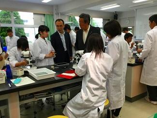 まずは5時間目に,副大臣には1年生の「自然科学と災害A」と「くらしと安全A」をご覧いただきました。「自然科学と災害A」では避難所を想定した菌の培養実験です。手を洗った場合と,洗わなかった場合の違いについて,実際にその違いを培地を用いて実験観察している様子をご覧いただきました。「くらしと安全A」では妊婦体験や乳児を抱き上げる体験をご覧いただきました。このような災害弱者をどのように避難させるか,どんな支援ができるのかを考えさせる授業です。2つの授業とも副大臣は生徒の中に入って,いろいろな質問をなされながら,見学されていました。