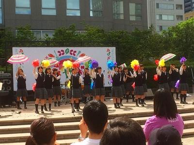 本番前にニホンジンプロジェクトの方と円陣を組んで「一致!団結!」と気合を入れてからステージに向かいました。ステージ前にはたくさんのお客さんがいらっしゃり,少し緊張しましたが,私たちの演奏に合わせてリズムに乗ってくださった方も多く楽しいステージになりました。