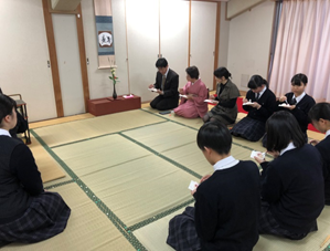 新年を迎えての最初のお稽古(初釜)を1月11日に行いました。外部指導員の先生方ご指導のもと、校長先生に正客(しょうきゃく…茶道での一番上座の客)として参加していただきました!