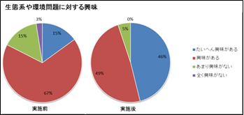 生徒の生態系や環境問題に対する興味は,「たいへん興味がある」と答えた生徒が講話前の15%から講話後には46%にまで増加し,全体の95%が興味を持つようになりました。また,津波被災地の生態系の変化については,「よく知っている」「知っている」と答えた生徒が講話前の22%から82%に増加し,理解も深まったという結果になりました。さらに,「これから復興についてよく考え,議論したい」と解答した生徒は,講話前の10%から50%にまで増加し,永幡氏の講話を聞いて,より深く学び,多くの人と様々な視点から議論までしたいと考える生徒が増えたと考えられます。