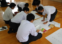 前半は,指定避難所や開設時に起こりうること,運営時のポイントなどを教えていただきました。後半は,多賀城高校の図面を用いて避難所設営の図上訓練を行いました。前半に学んだ避難所設営・運営のポイントを踏まえながら,ブースの配置や特別教室の使い方,ヘリポートの設置など様々な状況を想定して図上に書き込みました。お互いの発表を聞くことで,通路確保の大切さなど,自分たちの班にはなかった考えにも気付くことができました。