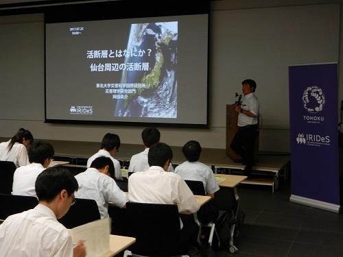 7月25日(火)総合学習の一環として東北大学のオープンキャンパスに参加してきました。午前中,普通科の理系希望者及び災害科学科の生徒達は,青葉山キャンパスの災害科学国際研究所にて,岡田真介助教による「活断層とはなにか? 仙台周辺の活断層」の講義を受講しました。生徒達は,多角的なアプローチがなされる研究の実際に触れ,向学心や探究心を高めたようです。また「震災の記録映像」を視聴し,あらためて,科学的な視点から防災・減災について考えることの重要性を感じることができました。