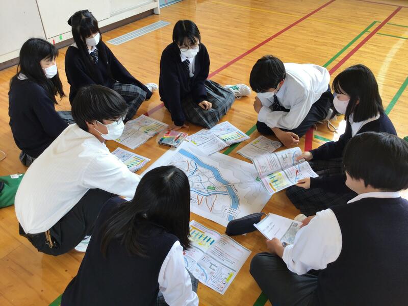 生徒達は8人程度でグループを作り、グループに配布された模造紙に描かれた架空の地図を見ながら、これから警報級の大雨が降る予報が出ているという状況のなか、住民をどのように避難させるべきか考えました。グループ内で活発に意見交換がなされ、避難ルートや避難先を決めていきました。さまざまな考え方が出ましたが、それぞれのグループが過去のデータと照らし合わせ、十分な根拠・理由を持って考えることができていました。