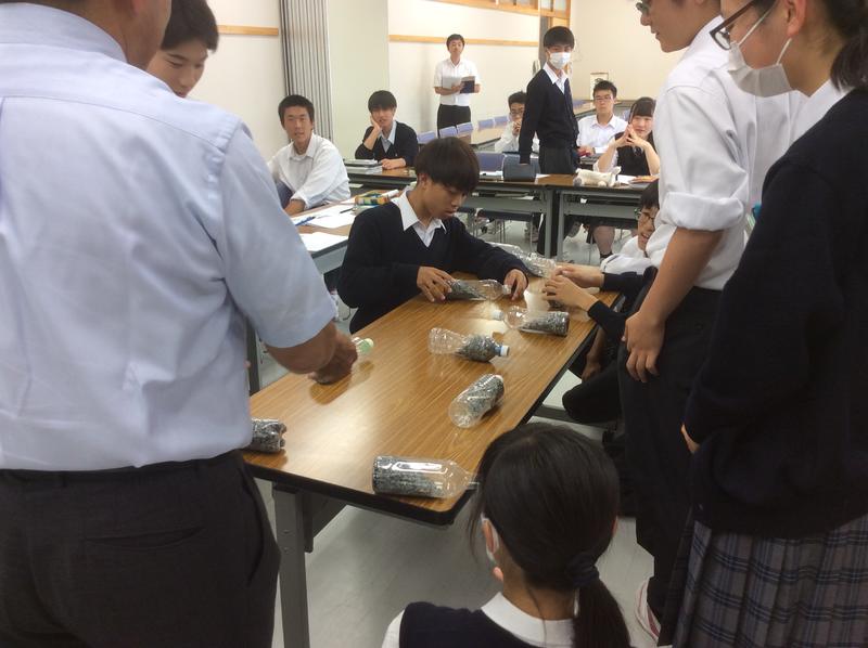 6月7日(金)に大崎市立鹿島台中学校の深瀬規友先生をお呼びして『地形や地質の特性と災害』をテーマに特別授業を行いました。深瀬先生は東北地方~北海道南部地域の地質工学を基礎とした災害・土木・環境・地下資源・活断層等の多岐にわたるコンサルタント業務の経験から、地質の特性や岩盤に起因した災害の実例紹介や,「液状化」,「岩盤の泥濘化」,「地下水と安定勾配」などの演示や演習を見せていただきました。