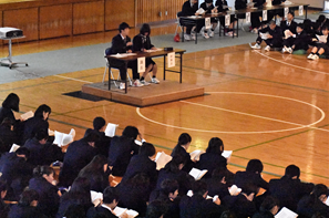 5月11日(金)に,前期生徒総会が行われました。今回は「ペットボトルキャップの回収方法」と「中庭の活用方法について」話し合いをもちました。「ペットボトルキャップの回収方法」については,各クラスから出してもらった意見を多数決で絞り,全校生徒で共通して心掛けるルールを話し合いました。