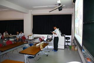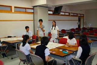 七ヶ浜国際村では,2年生の門間大輝君が七ヶ浜の被災の様子や多賀城高校が国際村で行っている外国人向けのボランティア活動の紹介をiPadを用いて行いました。中学生と保護者の方々は,門間さんの説明にしっかりと耳を傾けていました。