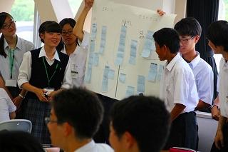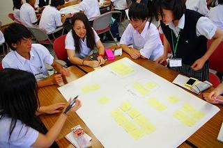 各グループに分かれ、付箋を利用しながら生徒は思いついたアイディアを出し合っていきます。「家族の安否確認」「食糧の確保」「情報源の確保」など、様々な視点から意見が出されました。