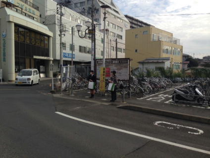 鉄道乗車マナー向上を呼びかけるティッシュを配布しながら、駅利用者の皆様方と挨拶を交わしました。