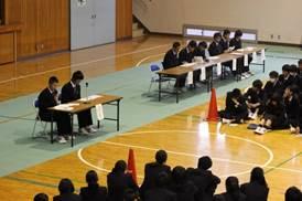 今回の議題は「壮行式の応援について」でした。これまで毎回応援方法がバラバラであったために,覚えられずに声を出せないということがありました。そこで,統一した応援方法を考えることになったのです。その結果,「さぁいきましょう!」を取り入れることになりました。今後の壮行式が今まで以上に盛り上がることを期待しています。