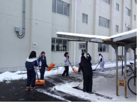 サッカー部、野球部など運動部みんなで協力して除雪を行いました。奉仕の心で仕事をすると、見慣れた校舎や駐輪場もぐっと身近な存在に感じます。