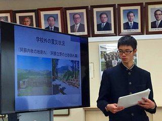 熊本地震直後の学校や近隣の様子,そしてこれまでの復興の様子について,丁寧に報告をしてくださいました。震災直後には体育館だけではなく,校庭には車で避難してきた方々が溢れていたそうです。そのような中,生徒会がボランティア活動を行い,避難してきた方々のお手伝いをしたことなどをお聞きしました。また,地震の影響で学校施設の一部が使用できなくなったことや,様々な行事への影響などについて話を聞きました。