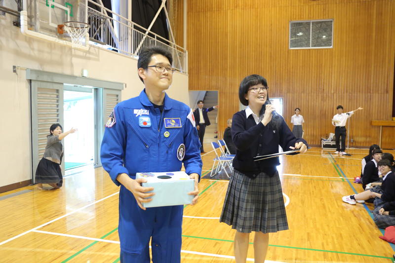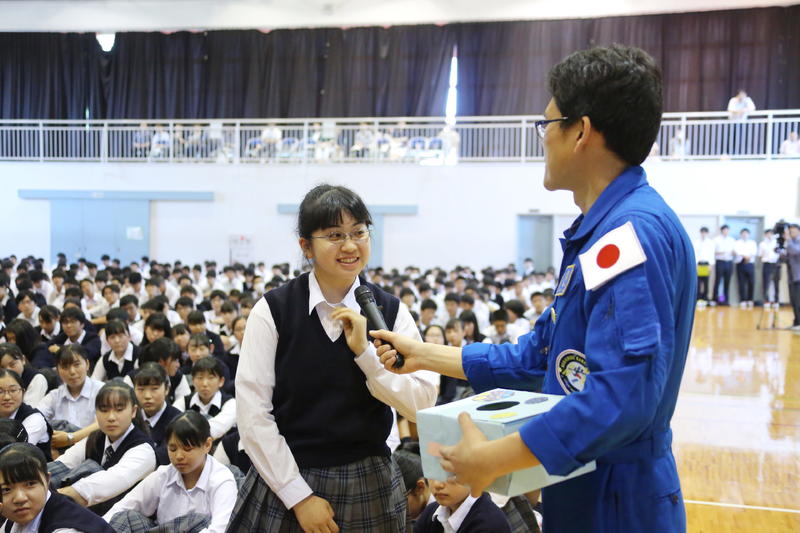 宇宙での活動のようすや宇宙飛行士選抜試験で出会った仲間とのこと、一歩踏み出して挑戦することについてお話ししていただき、生徒からの質問にも丁寧に答えていただきました。