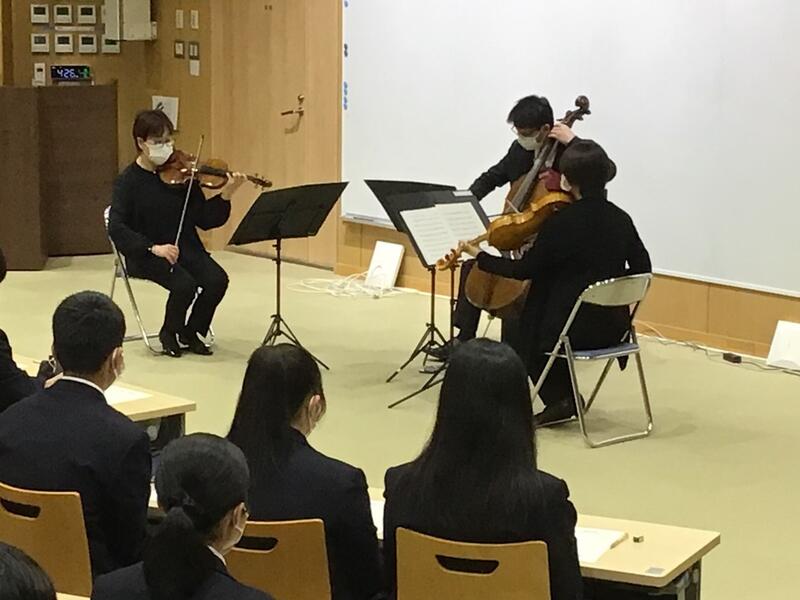 2月21日(火)3校時に山形交響楽団のヴァイオリン・ヴィオラ・チェロの3名の方々に御来校いただき,「音楽Ⅰ」の鑑賞に関する特別授業を実施しました。地元の多賀城市文化センター主催の行事で,山形交響楽団と連携しながら,教育現場や市内の施設で良質の音楽を身近に感じていただくためのアウトリーチを実施しており、今年度は多賀城高校での開催が実現しました。これまで学習してきた鑑賞のまとめとして,生演奏で雰囲気を味わい,特徴を実際に感じることが目的です。