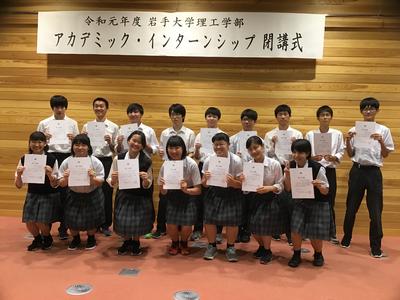 今年度も岩手大学理工学部アカデミックインターンシップが8月5日(月),6日(火)の2日間で実施されました。今年度は,岩手・宮城・秋田県から約100名参加しました。本校は,1泊2日の日程で,2学年で理系学部への大学進学を希望する生徒16名が参加しました。大学での学びについての講義,研究活動の体験,大学生・大学院生たちとの懇談などを通して,大学の仕組みや研究活動への理解を深めることができました。
