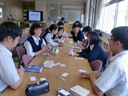 6月20日(火),図書館にてビブリオバトルを開催しました。 今回は「思い出の本」ということで,中学校以前に読んだ本を紹介し合いました。参加者は28名で4人グループ,7班に分かれて行いました。 初めてビブリオバトルをする生徒も多かったのですが,自分のお気に入りの本を握りしめ,たくさん本の魅力を伝える姿があちこちで見られました。