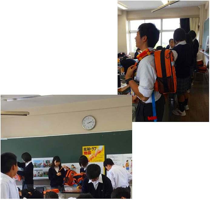 紹介していただいた防災リュックを身に付けることで,長時間仰向けのまま水に浮いていることが出来るそうです。災害時に目立オレンジ色のリュックの中には非常用の水や携行食も入っています。今後本校ではこのリュックの使い勝手や中身などについて考えていきたいと思います。