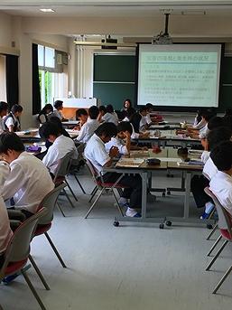 8月29日、宮城大学看護学部の高橋和子教授をお迎えし、『高齢者と健康』と題し特別授業をしていただきました。この授業は、教科「保健」の『加齢と健康』『高齢者のための社会的取り組み』の内容を踏まえ、さらに高齢者の災害時における安全について学ぶことを目的としたものです。