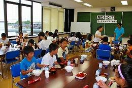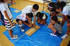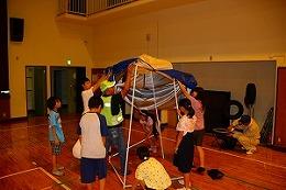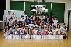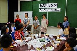小学生を対象にしたこのキャンプには,11名の小学生が参加しました。本校生徒は,多賀城二中の生徒と一緒に小学生とグループをつくり,共に活動したり体験のサポートをしたりしました。参加者は,「アルミ缶炊飯」や「防災○×クイズ」「ハザードマップから考えよう」「防災倉庫には何が入っているのか」「燃料電池自動車を知ろう」などの体験を通して,防災意識を高めていました。