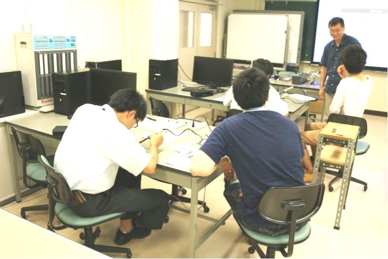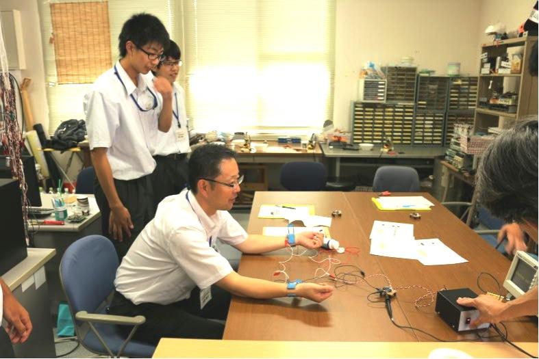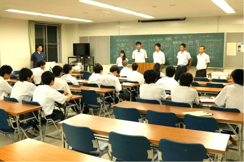 今日の実習内容,学んだこと,どう役立てるかなどをグループ毎に話し合い,その結果を報告して結果を共有しました。 工学部高木浩一教授には,太陽光パネルによる起電力測定の実験をご指導していただき,得られたデータの処理の方法を通して数学の重要性を学びました。 本校OBで工学部電気電子情報工学科2年の山田崇寛さんと旦尾一樹さんから,大学生活の様子,高校生活でやるべきことについて貴重な話を聞くことができました。