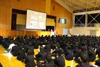 新潟県を出発した見附高校の2年生は、午後、本校生徒会や防災委員が歓迎する中 本校に到着しました。まずは、体育館でお互いの高校の様子を紹介しあい、特に本校が取り組む防災活動の様子には真剣なまなざしで聞き入ってました。